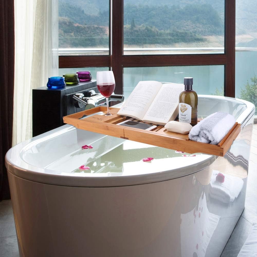 Royal craft wood luxury bathtub caddy tray, one or two person bath and bed tray, bonus free soap holder (natural bamboo color) (natural). This bamburoba bathtub caddy tray is perfect for people who love to soak in the tub and watch movies or read books while drinking wine. This bathtub caddy tray holds my books—and my wine. Imagine sitting in a tub, sipping a great wine and taking in the pleasant smell of a scented candle while reading your favorite novel… a bathtub caddy makes it all with your reach. Relax and enjoy your bath time in ultimate comfort with this bathtub stand holder.